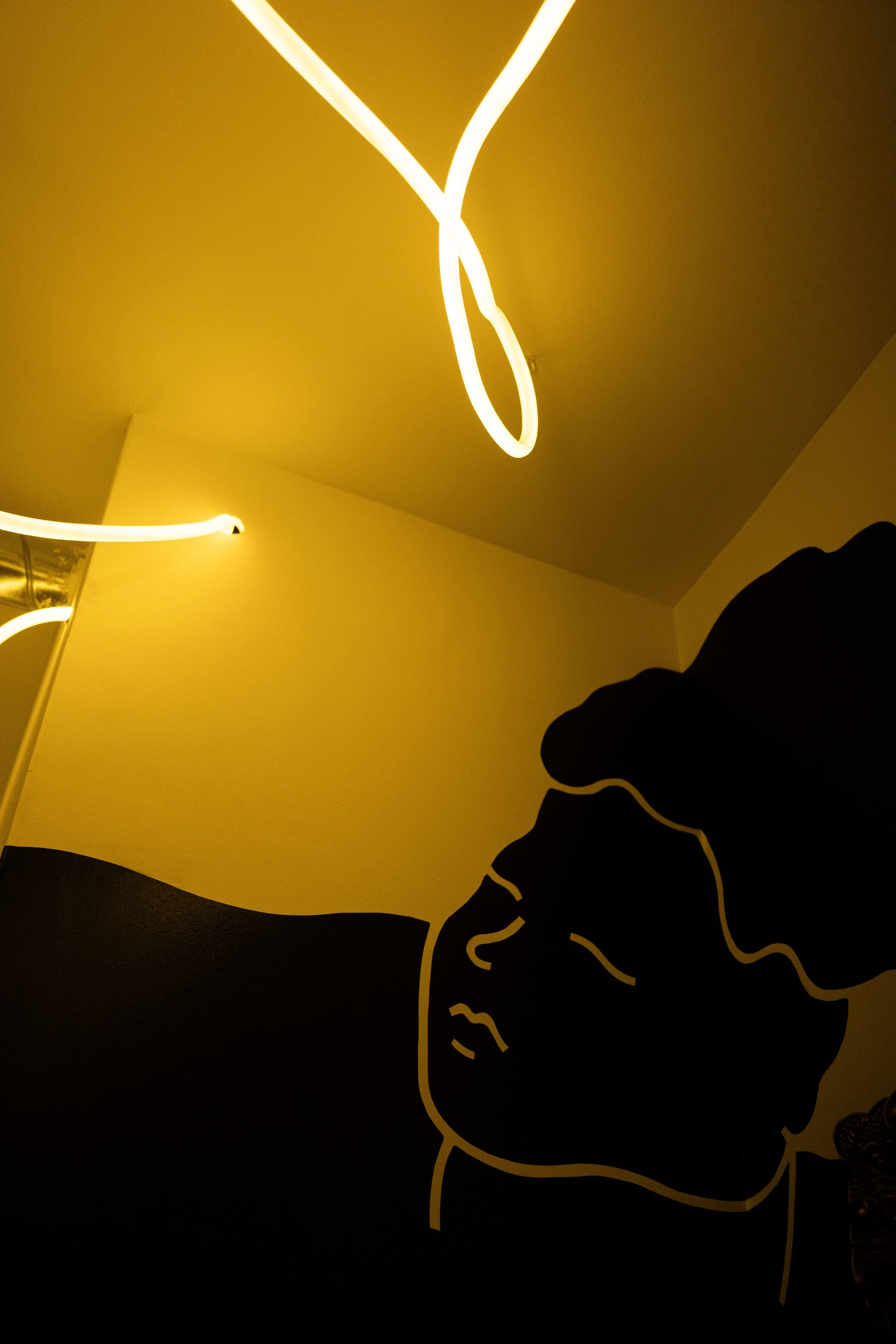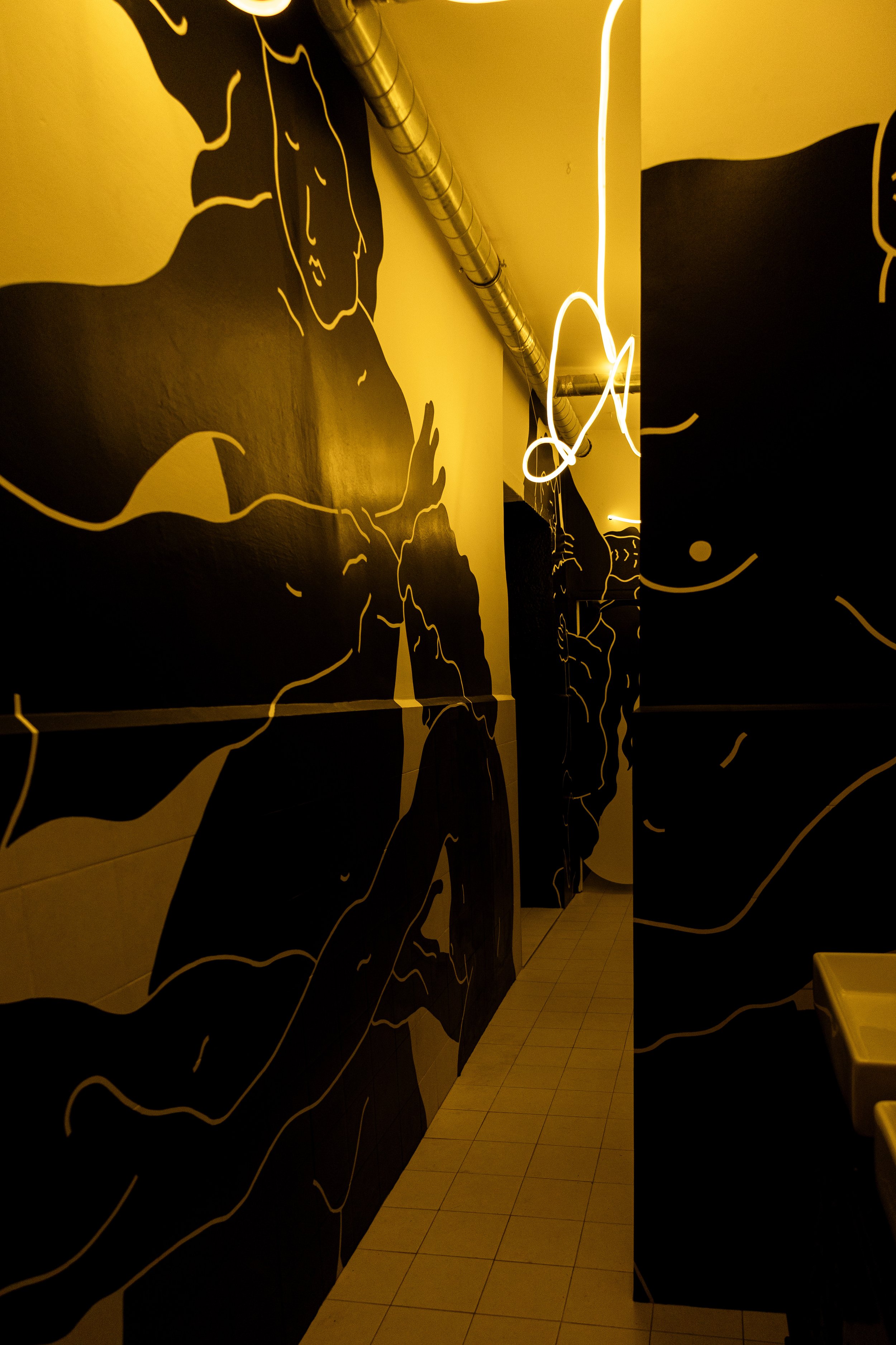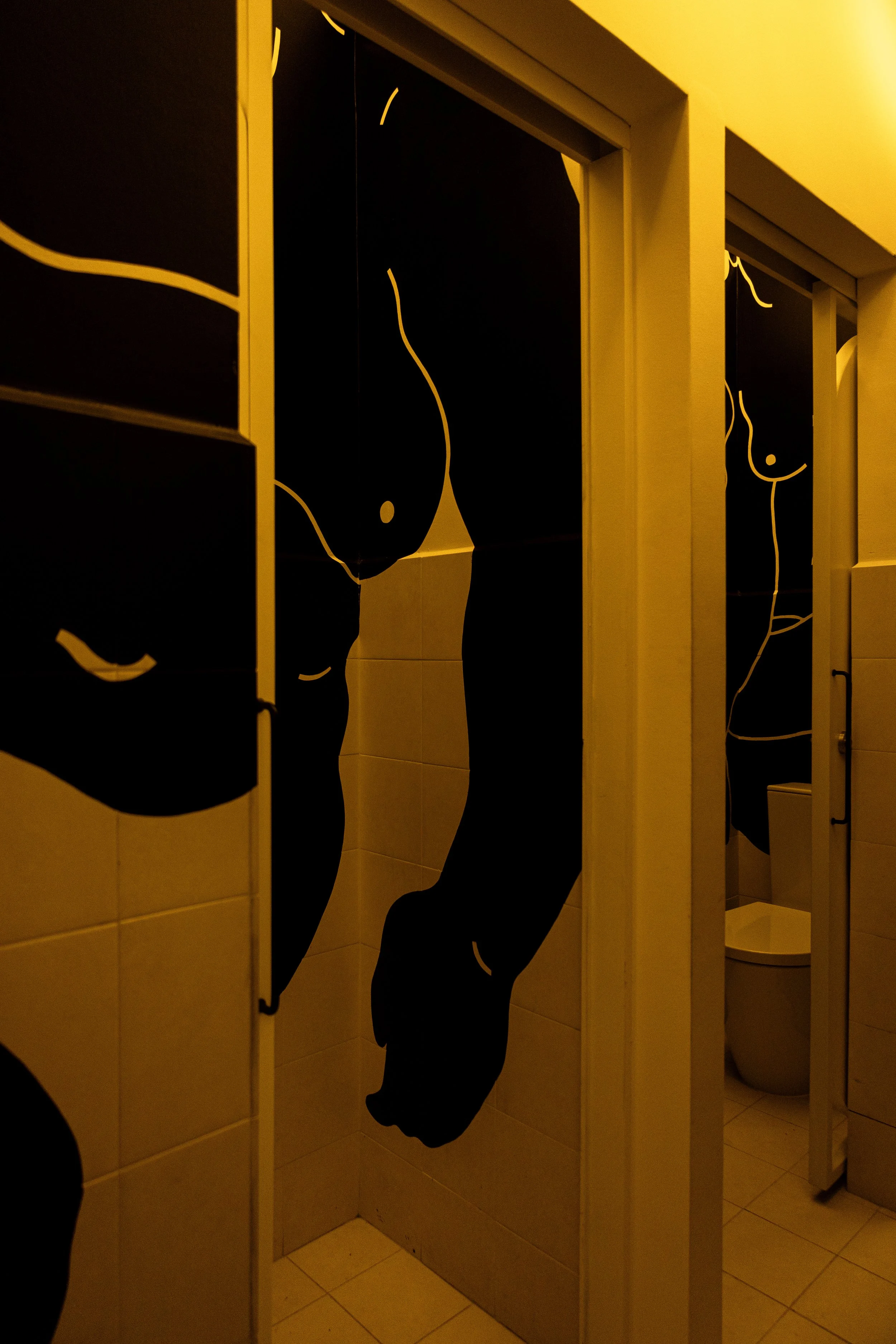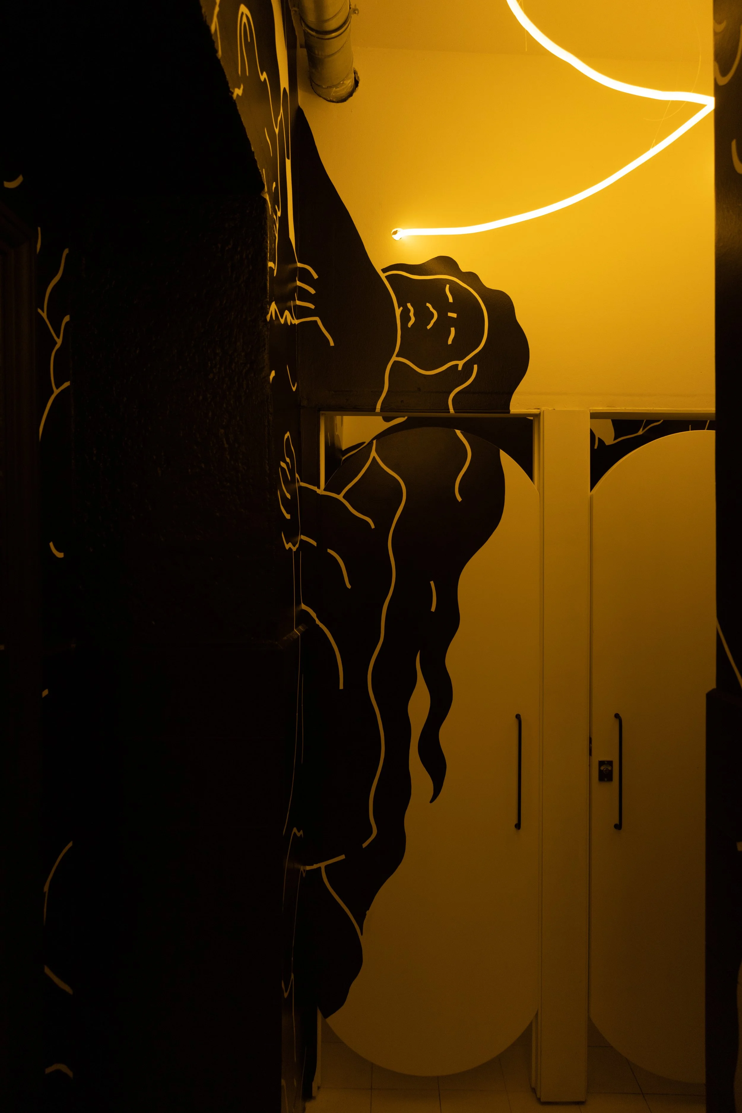 Ninfa & Sátiros . 2023 . bathroom installation . epoxy paint on tile, néon led