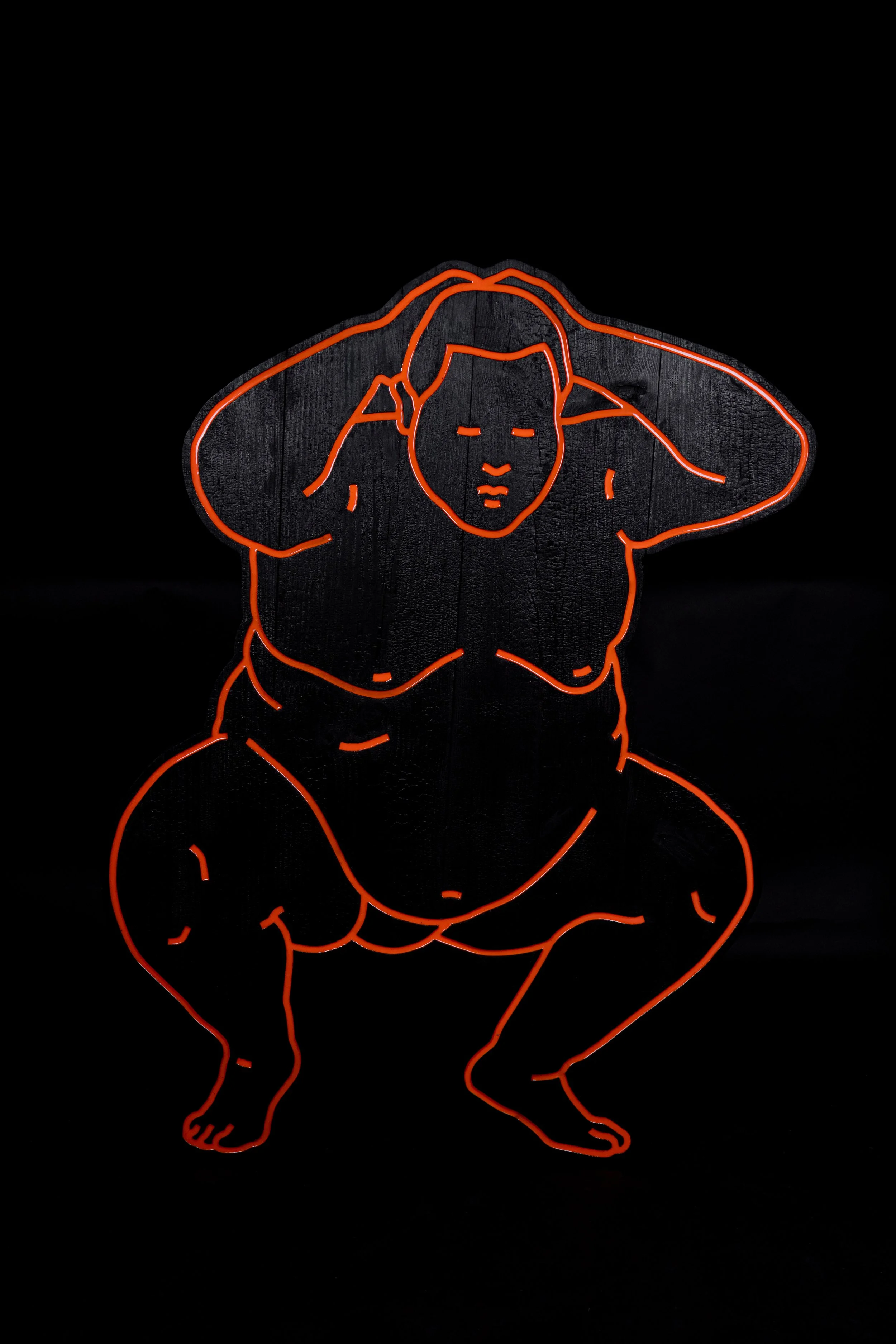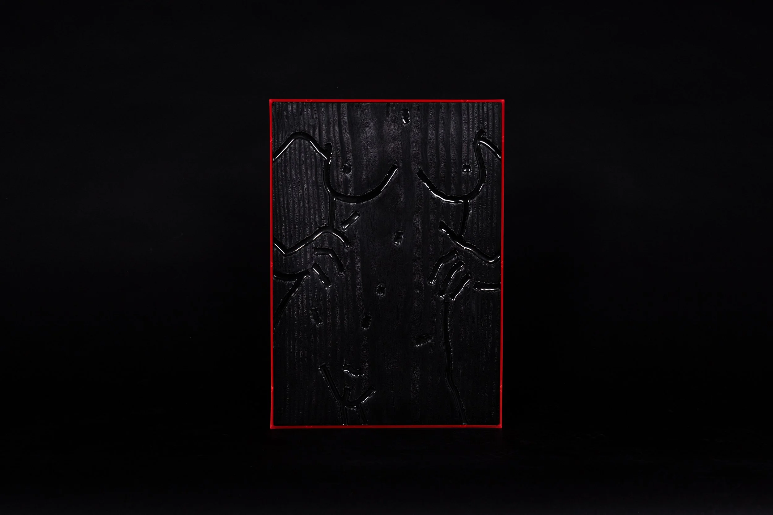 he navigates the complexity of his own being, exploring emotion and self-knowledge — by using fire to burn wood through the traditional Japanese technique yakisugi, transforming the material in a ritualistic gesture where what no longer serves him is transmuted.